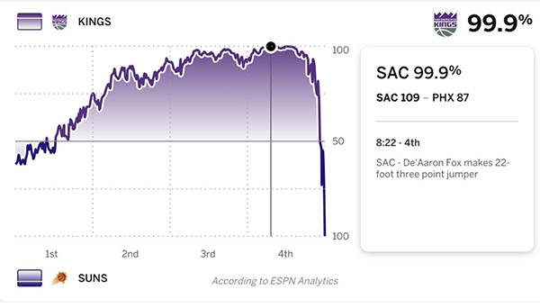 值得一提的是,这场比赛还剩下8分22秒的时候,国王领先22分,媒体预测他们的胜率高达99.9%,可以说基本上赢球是板上钉钉的状态,但很显然太阳不放弃,最终完成翻盘。
