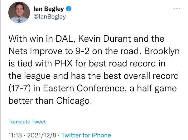篮网赛季至今客场战绩9胜2负,与太阳并列联盟最佳。
