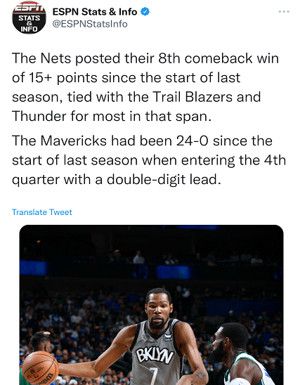 自上赛季以来,独行侠领先两位数进入末节的比赛战绩是24胜0负。这场他们三节领先11分,但末节被篮网将神迹终结。