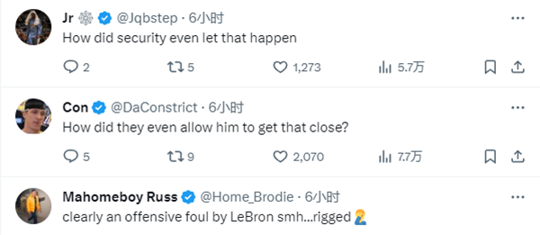 詹姆斯推开球迷一幕引热议,有球迷表示安保人员怎么能让他离詹姆斯这么近?安保怎么允许这种事发生?还有球迷调侃:很明显,这是詹姆斯的进攻犯规。