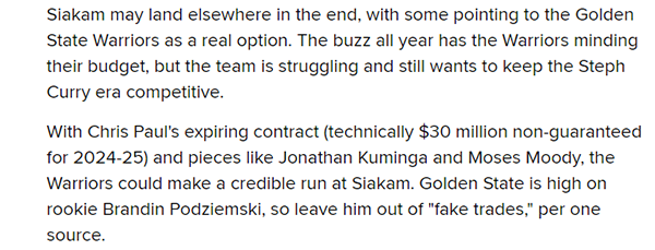Pincus表示,勇士可以依靠克里斯-保罗的到期合同(2024-25赛季3000万无保障)和库明加、摩西-穆迪这样的年轻球员作为筹码,对西亚卡姆进行可靠的竞争;勇士对新秀波杰姆斯基的期望很高,所以不会将他置于交易讨论之中。