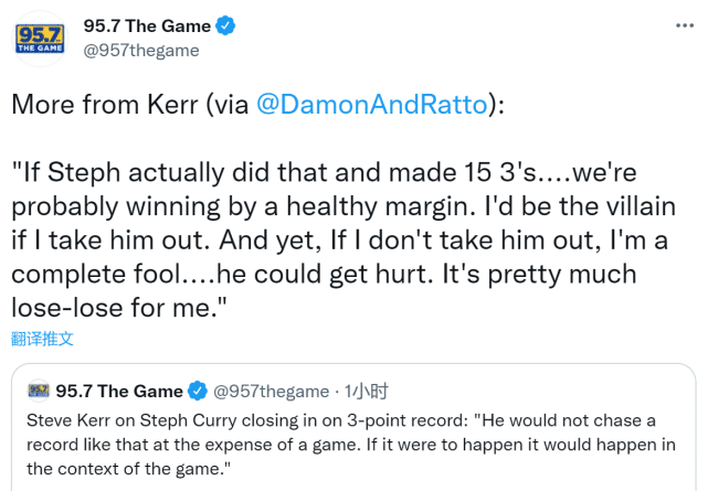 科尔说:库里不会以牺牲比赛为代价去追求三分纪录,如果它真的发生了,它也只会发生在正常比赛过程中,那件事会在追求胜利的背景下自然而然地发生。如果库里真的要投进15个三分,那我们应该会取得很大的领先优势。如果这时候我把他替换下场,那我将会成为一个恶人,而如果我不把他换下来,那我就是白痴,他可能会受伤,这对我来说是一个两难双输的局面。