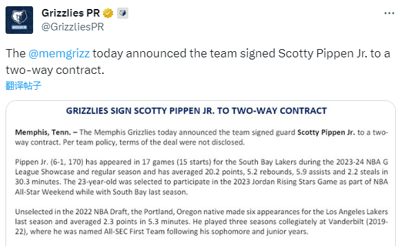 来源:JRS直播网01-17 13:21JRS直播网01月17日讯 湖人旧将&名宿之子小斯科蒂-皮蓬重返NBA,灰熊官方宣布,球队已经和小皮蓬签下一份双向合同;据名记Woj报道,他们双方签下一份为期两年的双向合同。