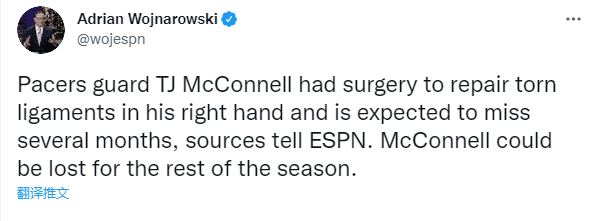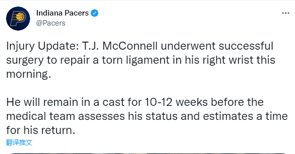 除了决定重建之外,步行者官方已经宣布,TJ-麦康奈尔已经成功接受右手韧带修复手术,将会戴着石膏10-12周,没有具体的复出时间表,名记沃纳罗斯基表示麦康纳尔将会缺席几个月,甚至可能缺席本赛季剩余的比赛。