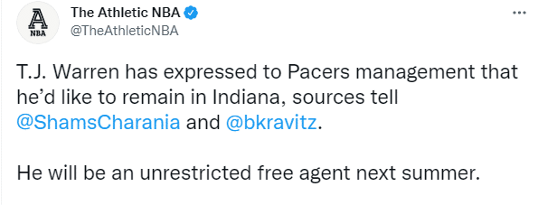 步行者超市开业,不过TJ-沃伦申请留队,他已经向管理层明确表态,想要继续留在印第安纳;沃伦曾在19-20赛季打出场均19.8分的出色表现,不过伤病阻挡了他的脚步,本赛季还没有打过比赛,年薪是1269万美元。