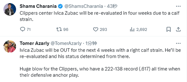 祖巴茨生涯第一次遭遇重大伤病,因伤至少伤停四周;据统计,快船生涯至今,祖巴茨出战时,快船222胜138负,胜率为61.7%;祖巴茨伤停,预计普拉姆利将获得更多的上场时间。