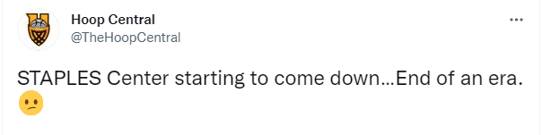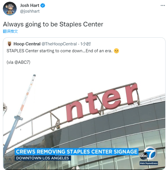 美媒Hoop Central感慨一个时代的终结,湖人旧将约什-哈特发推写道:永远都是斯台普斯中心。