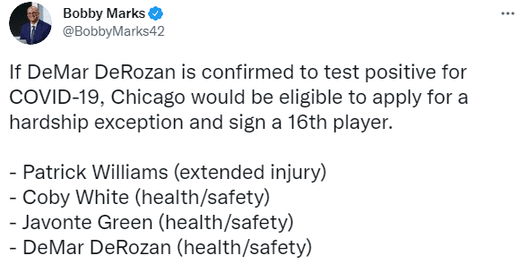 据薪资专家Bobby Marks报道,若德罗赞最终确诊为阳性,公牛有资格申请伤病特例并且签下第16名球员;目前公牛队内帕特里克-威廉姆斯伤停、科比-怀特、贾文特-格林和德罗赞都被隔离。