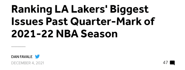 来源:JRS直播网12-05 15:41JRS直播网12月05日讯 12胜12负,不敌快船后,湖人的胜率再次回到50%。赛季已经过去四分之一,这支球队的表现令人失望。北京时间12月5日,知名美媒Bleacher Report列出了湖人目前面临的6大问题,让我们来倒序揭晓——