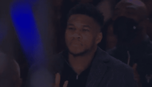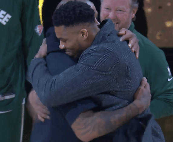 塔克正式领取总冠军戒指,满脸笑容拥抱字母哥,全场为他欢呼鼓掌