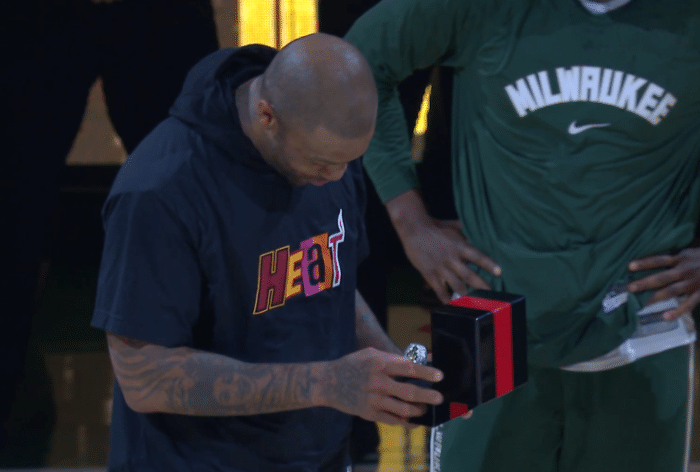 来源:JRS直播网12-05 11:10JRS直播网12月05日讯 ,在热火和雄鹿赛前,PJ-塔克正式领取属于自己的总冠军戒指,字母哥紧紧拥抱前队友,塔克认真打量这一枚总冠军戒指,满脸洋溢着幸福的笑容,雄鹿主场还为塔克播放致敬视频。