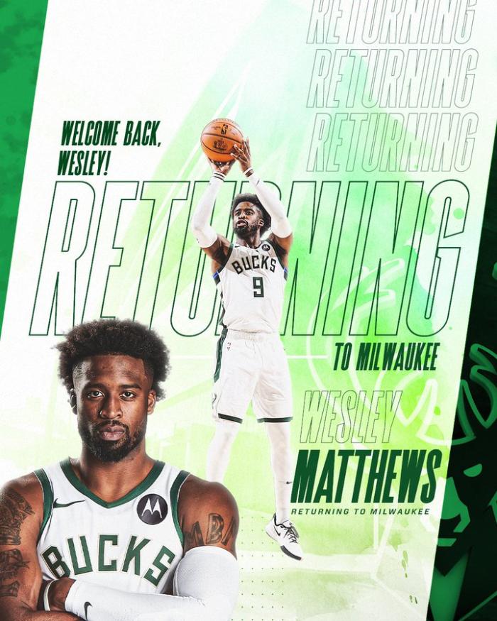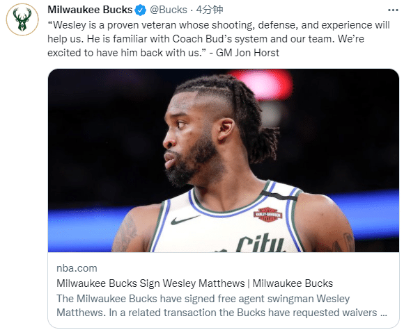 雄鹿官宣签约马修斯!再助字母哥冲冠改穿23号