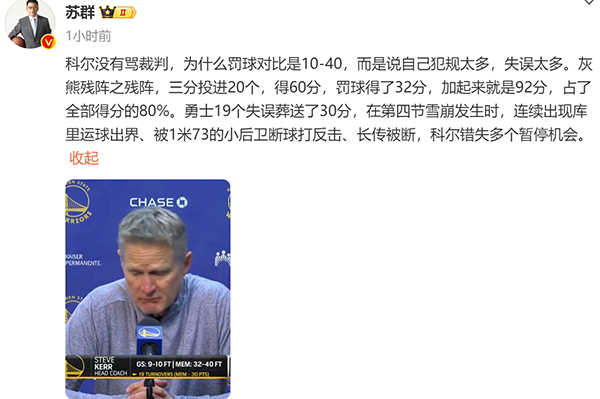 比赛结束之后,名嘴苏群怒斥库里和科尔,他直言作为教练的科尔临场指挥是有问题的,他错失多个暂停机会。谈到26分4篮板8助攻2抢断5次失误的库里,苏群表示库里连续两次低级失误,是很影响球队的。