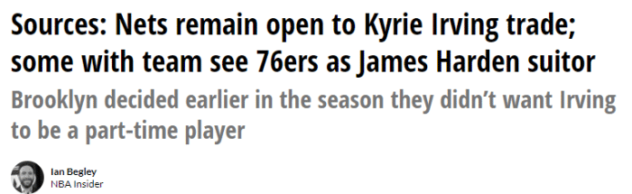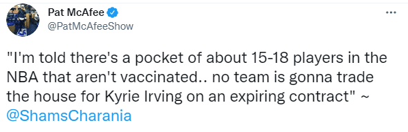 篮网交易欧文几乎无望,那么他们能劝说欧文归队吗?难如登天;不久前名记shams在节目中表示:欧文距离接种疫苗还差的很远,除非他被交易,否则欧文不会重返赛场。