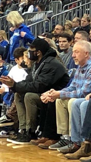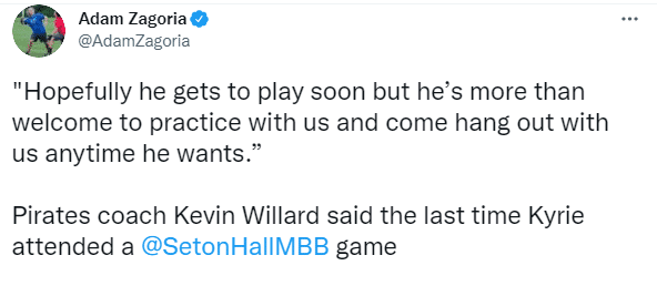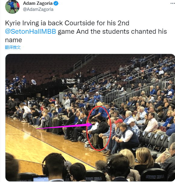 欧文身穿黑色板鞋和黑色外套、戴着黑色棒球帽和黑色口罩,坐在场边观看比赛;海盗队主教练凯文-威拉德谈到欧文上一次观看西顿大学的比赛,他表示:希望他能尽快上场(重返NBA赛场),但我们非常欢迎他和我们一起训练,随时都可以和我们在一起打球。