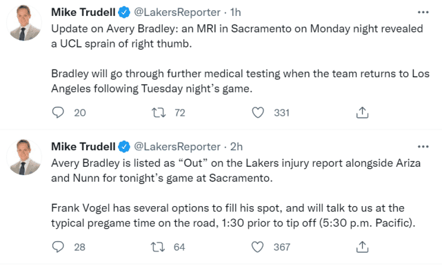 布拉德利的缺阵,意味着湖人需要再次更换首发阵容。他已经连续为湖人首发16场比赛,赛季至今,湖人已经使用过10套首发阵容。