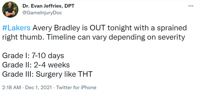 医学专家Evan Jeffries第一时间解析了布拉德利的伤情,他伤到的韧带和霍顿-塔克是一样的。布拉德利的复出时间表,将取决于这次受伤的严重程度。如果是一级扭伤,康复大约需要7-10天。如果是二级扭伤,就需要2-4周。如果是三级扭伤,就和此前的霍顿-塔克类似,需要手术治疗以及更长的康复时间。