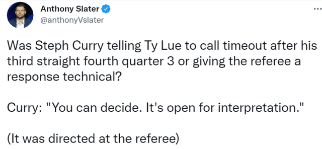 赛后,勇士记者向库里求证这一手势的含义。库里微笑看着记者,回答道:“你们来决定,解释是开放的。”记者斯雷特指出,库里冲着裁判做了这个手势。