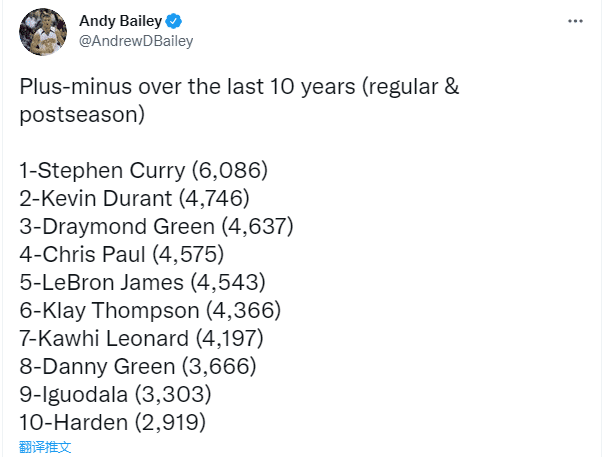 库里在场上的影响太大,近十年正负值总和+6086(相当于在场赢分),比排在第二名的杜兰特多出1340;湖人巨星詹姆斯+4543排在第五名,哈登+2919排名第十;值得一提的是,勇士队四人榜上有名——库里、格林、汤普森和伊戈达拉,这是勇士5年3冠的核心阵容,另外杜兰特是勇士两连冠的大功臣。