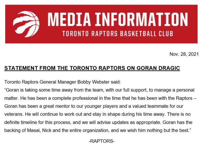 他在猛龙队期间是一名完全的职业球员。对于我们的年轻球员来说,他是一位伟大的导师,对于我们的老将来说,他是一位有价值的队友。在他离开期间,他将继续锻炼并保持身材。没有明确的归队时间表,德拉季奇得到了猛龙全队的支持,我们祝愿他。