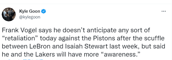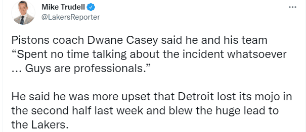 对于此前的冲突事件,活塞队主教练凯西说,他和他的团队没有花时间谈论这件事,大家都是职业球员;凯西还表示上周底特律在下半场集体哑火,带着巨大的15分领先优势却输给了湖人,这让他更加沮丧。