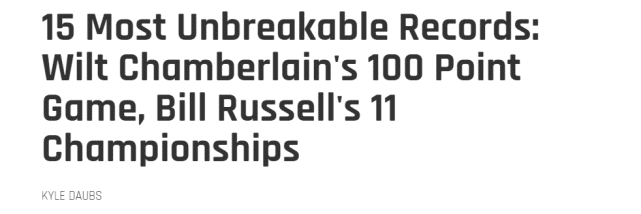 来源:JRS直播网11-28 15:07JRS直播网11月28日讯 NBA已经迎来75周年,哪些个人纪录是最难打破的呢?北京时间11月28日,美媒Fadeaway World评出了史上最难打破的15项个人纪录,张伯伦一人独占5席,现役无人上榜。