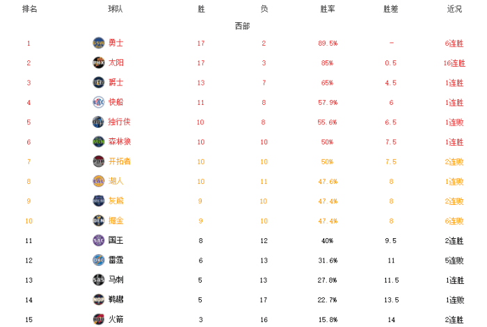 来源:JRS直播网11-28 15:06JRS直播网11月28日讯 ,NBA常规赛结束了8场焦点战,其中包括了太阳16连胜紧追榜首的勇士,篮网遗憾落败,火箭本赛季第一次连胜,奇才、尼克斯和热火等队也都拿下了胜利。接下来我们一起来看看NBA最新排名。