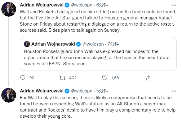 此前沃尔和火箭达成分手协议,在交易达成之前沃尔不会代表火箭出战;但如今这位五届全明星后卫在周六与休斯顿总经理拉斐尔-斯通谈了关于重新回到火箭阵容中的对话,双方计划下周一再次会谈。