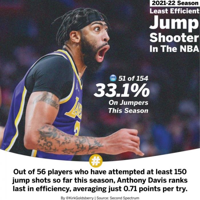 据数据专家Kirk Goldsberry统计,本赛季56名跳投次数超过150次的球员中,浓眉跳投154投51中,命中率33.1%联盟最差,每次跳投仅仅得到0.71分,效率排在倒数第一。