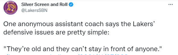 对于湖人的现状,联盟某助教表示:现在湖人太老了,他们无法阻挡任何人!