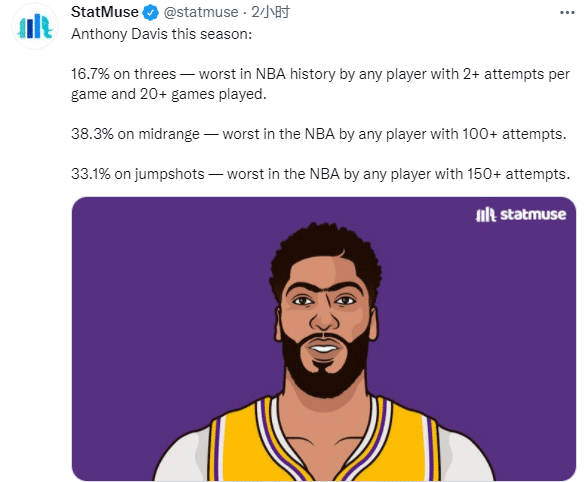 据StatMuse统计,安东尼-戴维斯本赛季的三项糟糕数据: