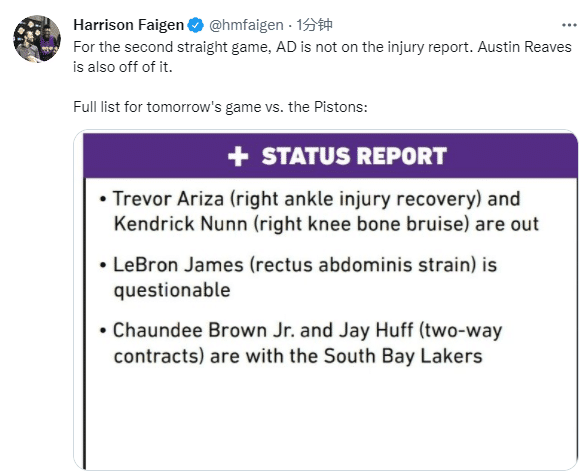 湖人伤病名单上还有三名球员,詹姆斯的伤势还没好透;浓眉已经连续两场不在伤病名单,这说明他已经摆脱伤病的困扰,此前腿筋拉伤的里夫斯也已经痊愈,下一场对阵活塞有望重返赛场。