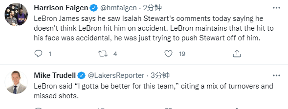 此前斯图尔特最后一次回应与詹姆斯的冲突事件, 他表示:我回看了比赛录像,那不是一次意外;今日赛后,詹姆斯再次重申自己不是故意的,湖人将在下周一对阵活塞。