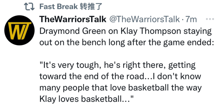 据悉之后科尔库里追梦陪着汤神说话,回更衣室了!赛后众将也都谈到了这一画面,追梦格林表示“我不知道有多少人像他那样热爱篮球,我可以表达我对他的爱,表达我的支持…看着他征服自己的(复出)旅程真是太棒了”