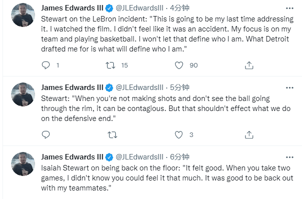再次谈到此前的冲突事件,斯图尔特表示:这将是我最后一次公开回应。我看了回放,我不觉得这是一场意外。我的重点是我的球队和打篮球。我不会让那个定义我是谁。底特律选中我的原因将定义我是谁。