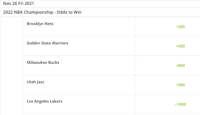 欧文依然拒绝接种疫苗,但篮网没有停止前进的脚步。一波4连胜后,篮网以14胜5负的战绩排名东部第一,休赛期至今,篮网一直是新赛季总冠军的头号热门,勇士虽然打出了胜率更高的开局,但仍未撼动篮网夺冠赔率榜首的位置。目前,他们的夺冠赔率是+265。