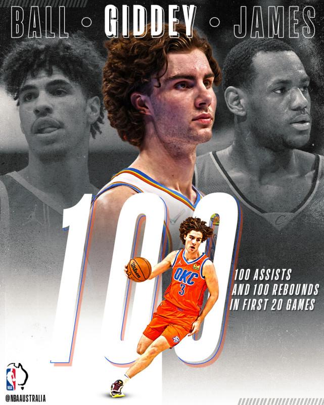 来源:JRS直播网11-26 14:56JRS直播网11月26日讯 昨日对爵士一战,雷霆6号秀约什-吉迪拿下19分7篮板8助攻的数据。前18场比赛,他累计得到131个篮板和105次助攻,成为又一位生涯前20场比赛至少得到100篮板和100助攻的球员。20岁前能做到这一点的,只有他、詹姆斯和三球。这一天,吉迪的年龄是19岁45天。