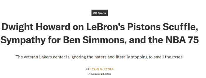 来源:JRS直播网11-26 14:49JRS直播网11月26日讯 ,霍华德接受《GQ》专访谈到了很多话题,包括自己落选75大巨星、如今在湖人的处境等等,引起了热议!