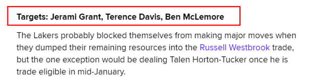 B/R不止一次提到湖人和格兰特之间的流言,因为本赛季结束后,格兰特的合同只剩下一年,活塞尚未决定是否再和他续约,如果他们不想续约格兰特,在交易截止日前送走他也是一个选择。湖人要是能得到格兰特,就能增加侧翼的攻防能力。