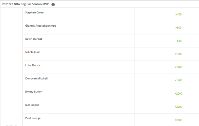 来源:JRS直播网11-25 16:04JRS直播网讯 北京时间11月25日,2021-22赛季的常规赛MVP赔率更新,勇士球星库里依然处于领跑位置,而且进一步扩大领先优势。字母哥超越杜兰特,独占第二,杜兰特排名第三,上赛季的MVP约基奇位居第四,东契奇和米切尔并列第五。