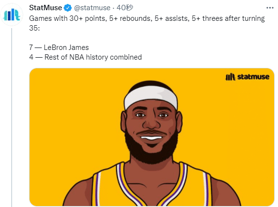 詹姆斯疯狂一战创纪录,35岁以后第7次拿到30+5+5的数据,成为该纪录历史第一人,历史上其他球员在35岁以后仅仅出现4次这样的数据;詹姆斯39分也创造赛季新高。