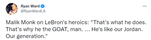 赛后,詹姆斯冲上热搜引热议,湖人官方发推高呼勒布朗-詹姆斯和国王庆祝;谈到詹姆斯的表现,蒙克表示:这就是他所做的。这就是他成为历史最佳(GOAT)的原因,伙计……他就像是我们的乔丹,我们这一代人的乔丹。