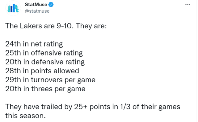 湖人的百回合净胜分排在第24位,进攻效率排名第25位,防守效率排名第20位,场均失分排名第28位,场均失误数排名第29位,场均三分命中数排名第20位。换句话说,无论是进攻端,还是防守端,湖人的表现都很糟糕。不止一家美媒感慨,湖人的状态根本不像一支有实力争冠的球队。