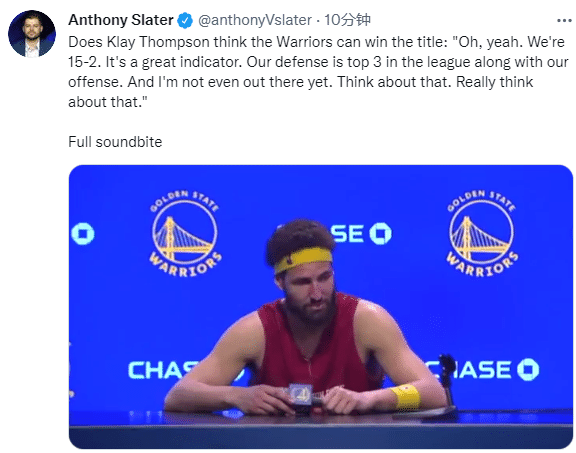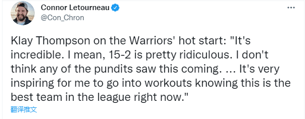 谈到勇士本赛季的战绩,汤普森表示:这太不可思议了。我是说,15-2真是太荒谬了。我认为没有任何一位专家能预见到这一点;我知道我们现在是联盟中最好的球队,这非常鼓舞我投入训练。