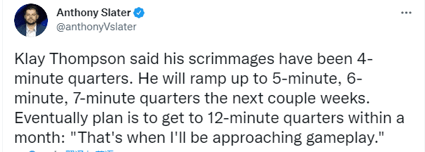 谈到对抗赛,汤普森表示现在他一节打4分钟,接下来的几周时间内,他将逐渐提高上场时间,5分钟、6分钟、7分钟....最终的复出计划是在1个月内达到单节上场12分钟:到那时我就接近复出了。