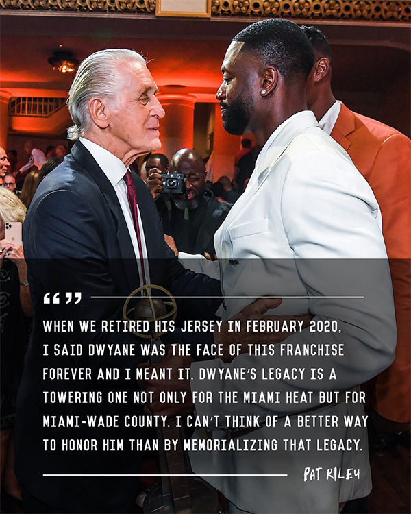 帕特-莱利正式宣布,球队今年晚些时候将在Kaseya中心球馆为韦德建造一座高8英尺(约2.3米)的雕像;莱利还声明:我们在2020年退役韦德的球衣的时候,我就和韦德说,他是这支球队永远的门面,我是认真的。韦德的伟大是一座灯塔,不仅照亮了迈阿密热火,更照亮了整个韦德郡。我想不出比雕像更好的、铭记他的伟大的方式。