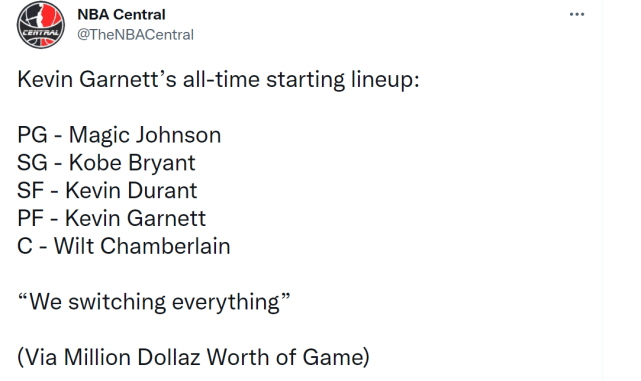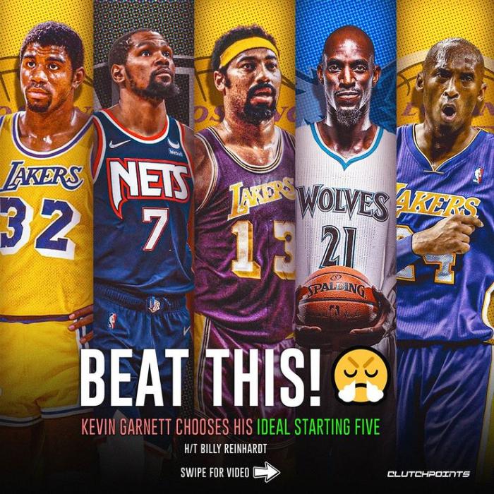 加内特还提到了艾弗森,“我真的也想选艾弗森,但我们谈论的是一支球队,所以我们每个人都必须要有换防的能力。小前锋我选杜兰特,中锋我会选张伯伦,然后我自己打四号位,这样我们就能无限换防。”