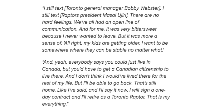 虽然洛瑞离开了猛龙,但他和这支球队的关系依然很好。“我仍会给鲍比-韦伯斯特(猛龙总经理)发短信,仍会给马赛-乌杰里(猛龙总裁)发短信,没有任何不愉快的感觉。我们一直有公开的交流渠道,对我来说,这是苦乐参半的,因为我从来没有想离开,但更多时候是一种感觉‘好吧,我的孩子们都长大了,我想去一个无论如何可以稳定下来的地方’。”