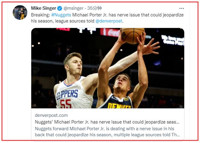 据丹佛记者Mike Singer报道,小波特目前正在处理背部的神经问题,这很可能导致他整个赛季报销。