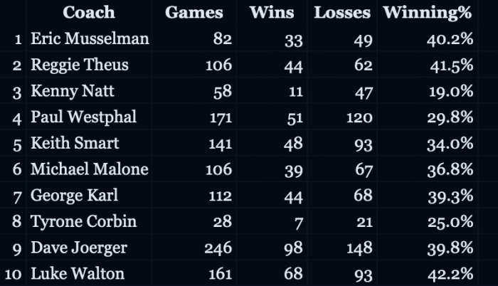 自从 2006 年国王前主帅里克-阿德尔曼离开以来,萨克拉门托国王队在 15 年里换了10 名教练,并且没有进入季后赛;沃顿的替代者将成为国王近15年的第11位主帅。